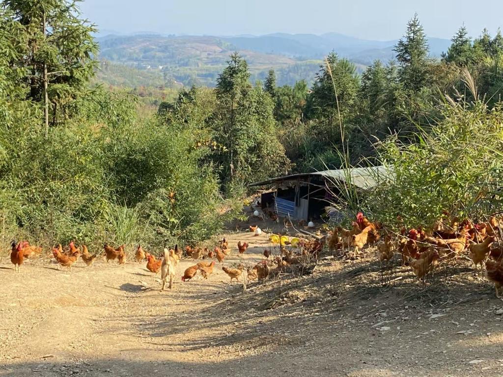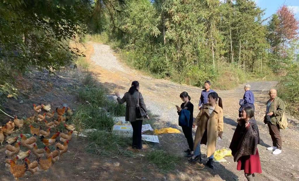郭剑一行在驻村工作队队长吴振华和村致富带头人、合作社成员等人的带领下深入山林放养生态土鸡基地、脐橙产地等进行现场考察。