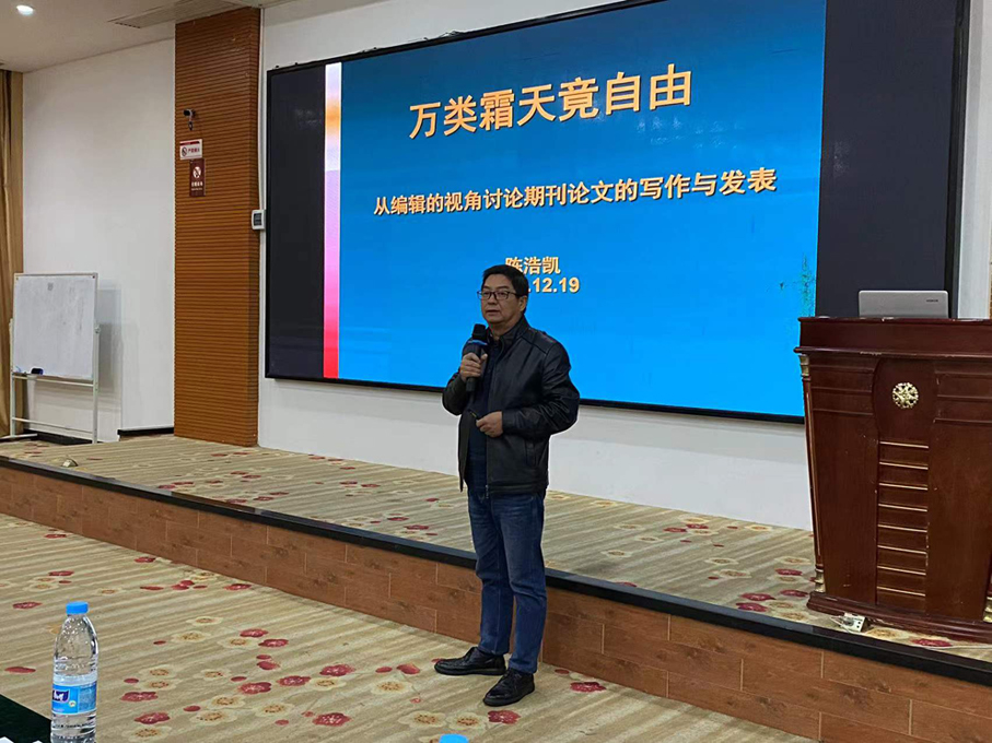 第二讲《万类霜天竞自由——从编辑的视角讨论期刊论文的写作与发表》由陈浩凯主讲。他从编辑的视角提到期刊论文的审核要求,如原创性、新颖性、真实性、语言流畅性、逻辑清晰性等。他还通过分析正、反面案例,向青年教师提出论文投稿建议,分析在国际高技术竞争激烈情况下,要创造出“高新”“趋新”“开阔”的文章应当具备的要素。