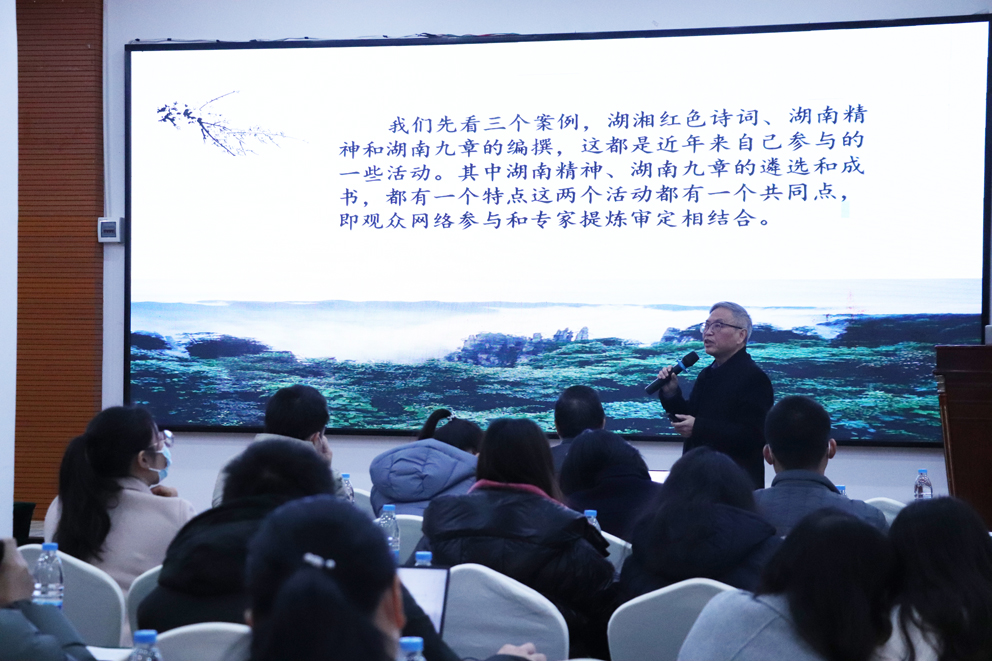 专题讲座环节,成松柳带来第一讲《湖湘文化纵横谈》。他从湖湘文化的内涵和精神特质两个方面进行讲述。通过一个个鲜活的湘人和湘学事例展现了湖南精神的基本内核,如“血性”“忧患”“行动”等。他的精彩讲述让青年教师充分领略到了湖湘文化的诗与美,感悟到了湘人的伟大与卓越。