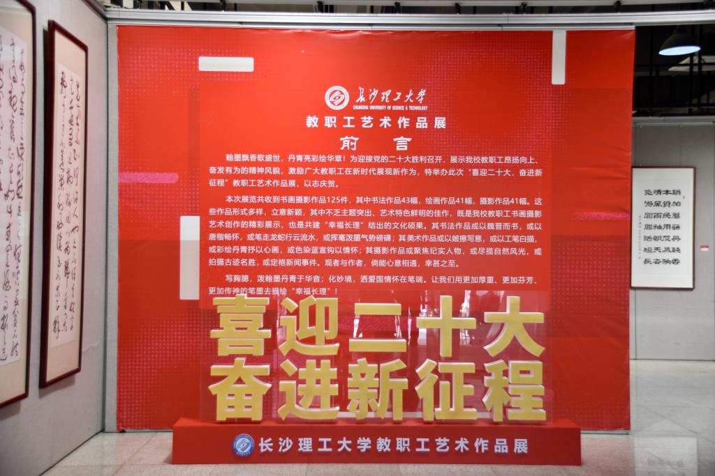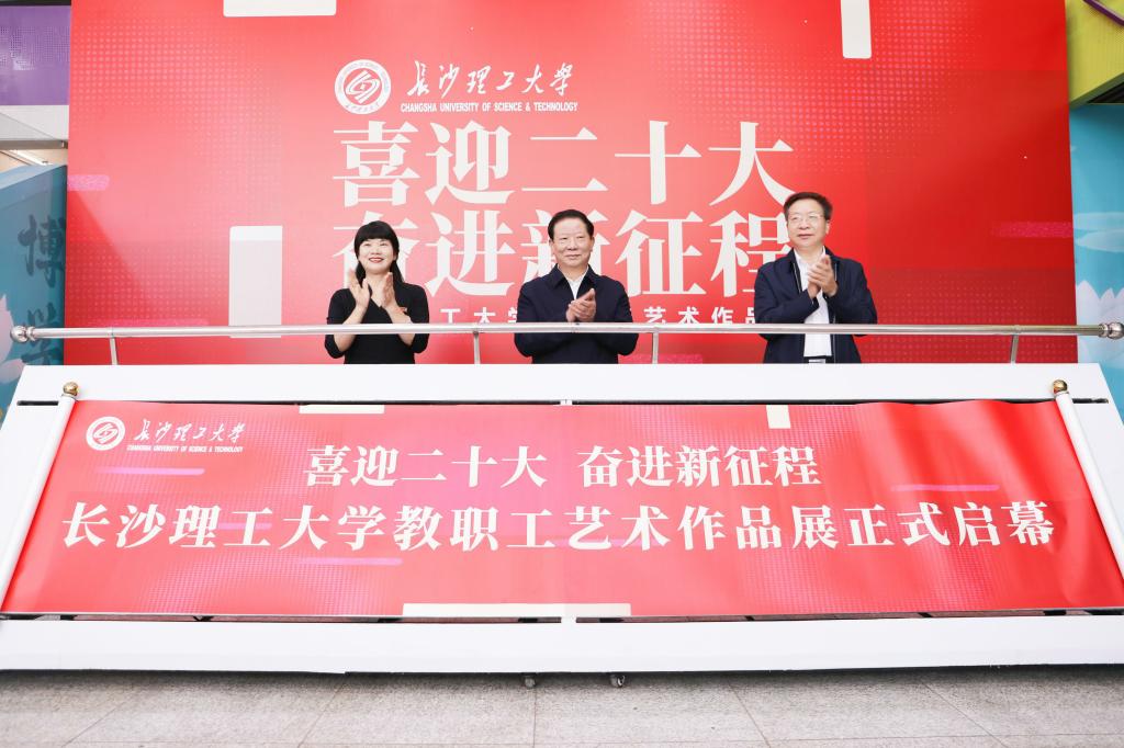 金秋时节处处芳华,丹青溢彩翰墨飘香。10月11日下午,由校工会主办,设计艺术学院、教职工摄影协会协办的“喜迎二十大 奋进新征程”教职工艺术作品展在云塘校区艺术楼举行开幕仪式。湖南省教育工会主席高新明、校党委书记付宏渊、党委委员、副校长蒋璟萍,以及各二级党组织书记、分工会主席、教职工代表近100人参加开幕式。开幕式由校工会常务副主席郭剑主持。