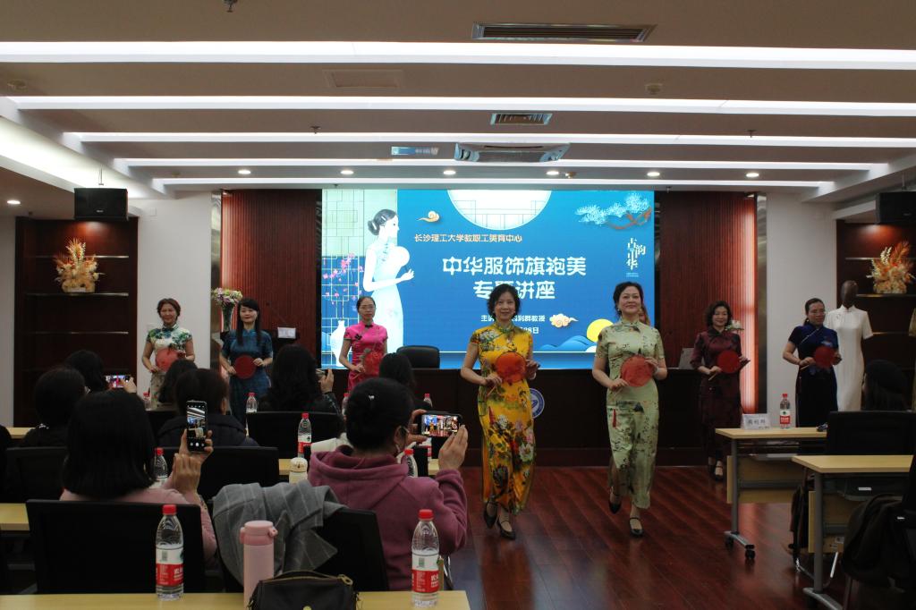 为弘扬中华优秀传统文化,进一步提高雷竞技官网教职工的艺术鉴赏能力和审美修养,3月28日下午,校工会特邀请湖南女子学院周利群教授来校举办“中华服饰旗袍美”专题讲座。校工会及各分工会女工委员、全校旗袍爱好者50余人参加活动。活动由校工会副主席王双主持。