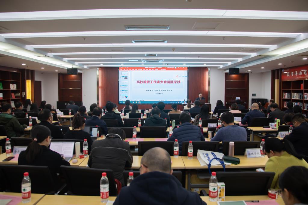邓三成授课的主题为《高校教职工代表大会问题探讨》,他结合大量实际案例和工作经验,对企事业单位民主管理的基本知识、高校民主管理现状和存在的问题、职工代表的产生及素质能力要求、职工代表履职的方法和技巧、如何撰写高质量的职工代表提案等内容进行了经验分享。