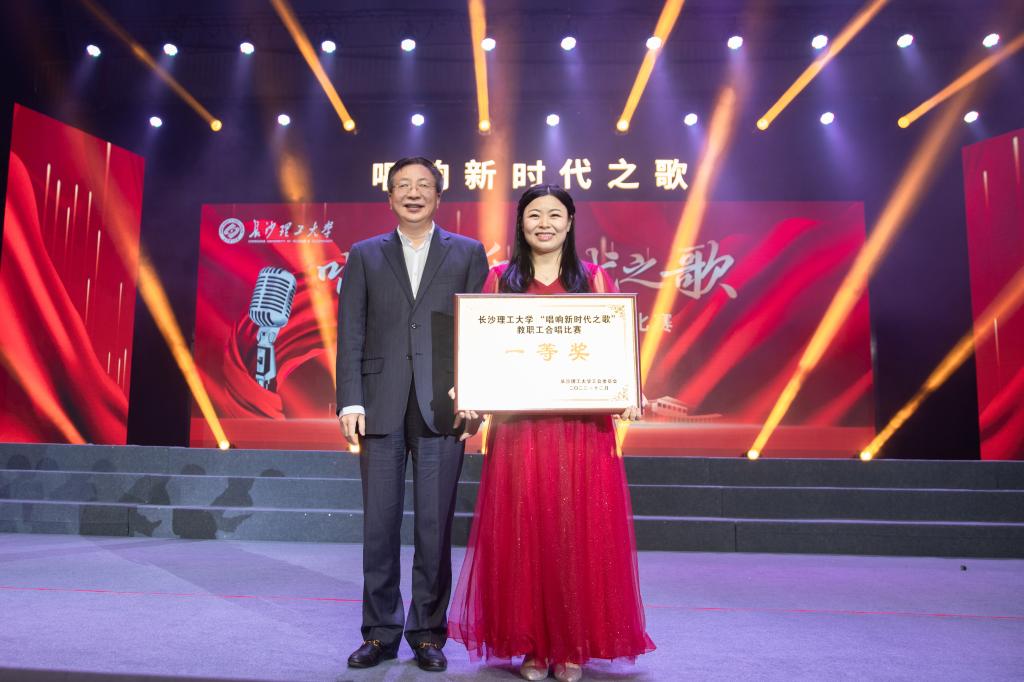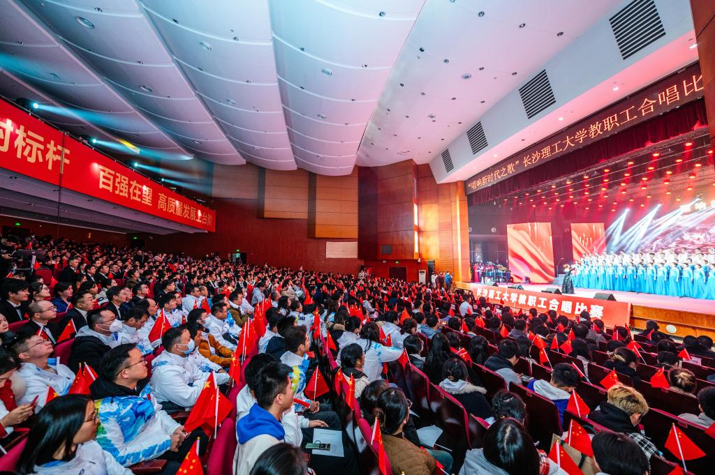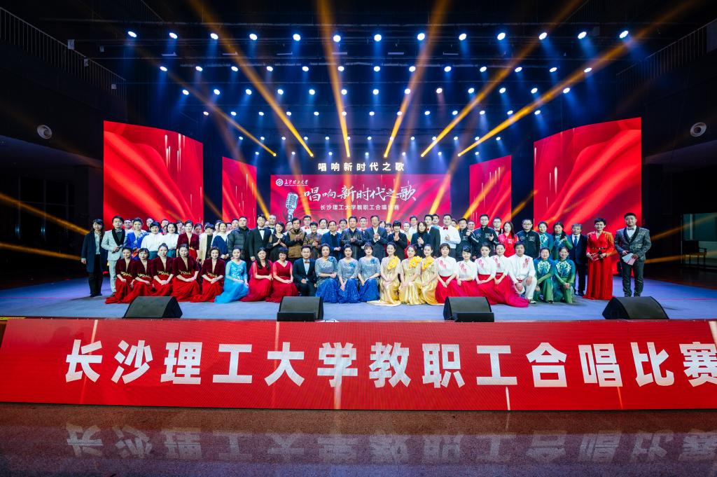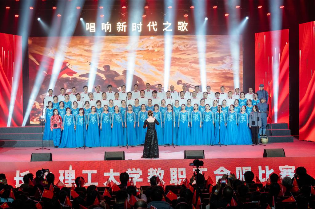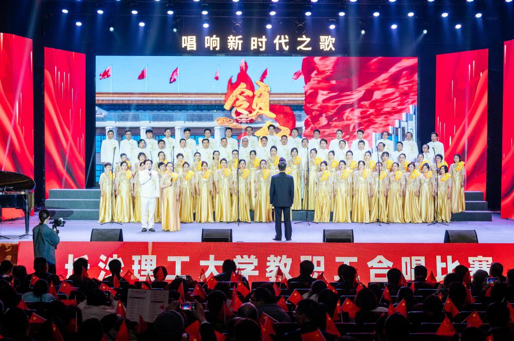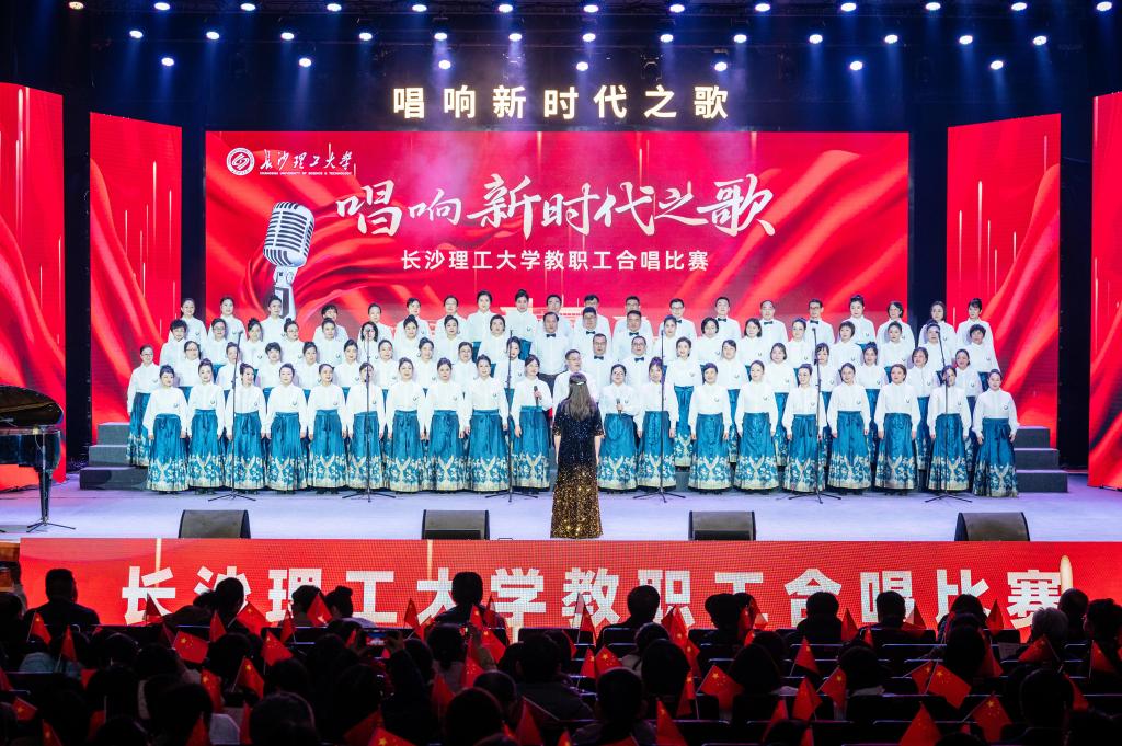 大会堂内歌声此起彼伏、掌声阵阵。12支教职工合唱队伍着装统一、精神饱满、依次登台、激情歌唱,共同唱响新时代之歌。表演者用歌声传递爱国爱党爱教爱校之情,以饱满的热情,将声乐与朗诵等其他表演艺术完美结合,为观众带来一场精彩纷呈的视听盛宴。《天路》《在太行山上》《我爱你中国》《祖国不会忘记》《领航》《走向复兴》《我的祖国》《军民团结一家亲》《唱支山歌给党听》《长沙理工大学校歌》……一首首经过各参赛队精心准备,脍炙人口的经典歌曲,气势磅礴、催人奋进,讴歌了中华民族实现伟大复兴的奋斗历程,唱出了教职工对祖国的无限热爱,传递出新时代长理人面向未来、共筑中华民族伟大复兴中国梦的坚定信心和良好的精神风貌。