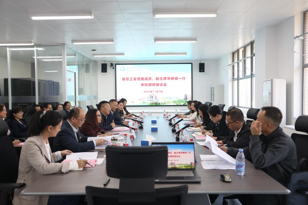 11月7日,湖南省总工会党组成员、副主席宋峥嵘一行来雷竞技官网进行工作调研。省总经贸建设工会副主任易丽鹏,省教育工会副主席朱冠星,校党委委员、副校长张军辉参加调研。