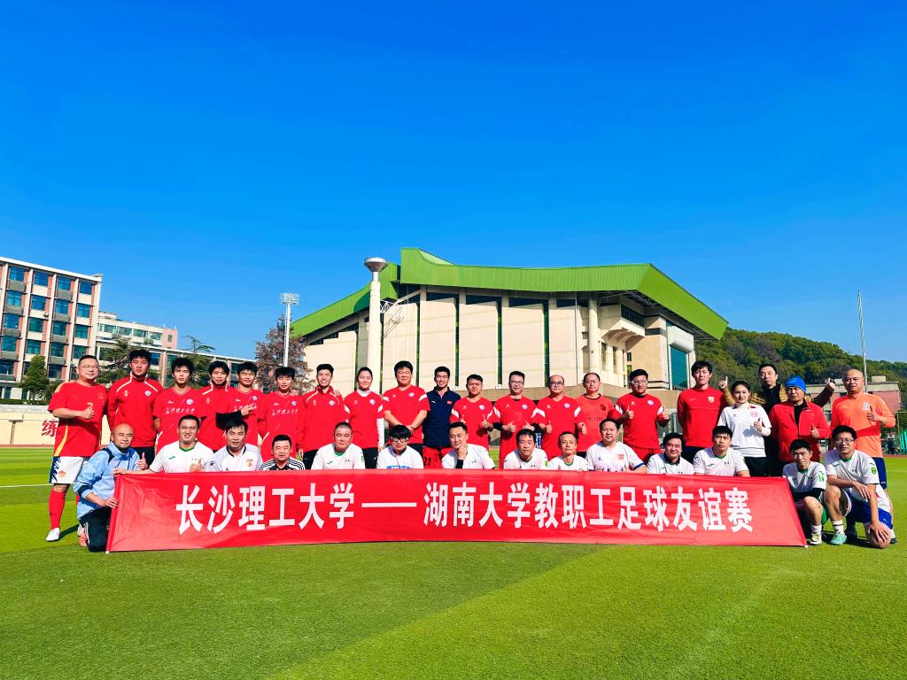 1月11日下午,长沙理工大学教职工足球队与湖南大学教职工足球队在湖南大学南校区足球场展开了一场精彩纷呈的友谊赛。两校教职工以球会友,在绿茵场上展现了精湛的球技与昂扬的精神风貌,现场百余位家属和观众共同见证了这场充满激情与友谊的体育交流活动。