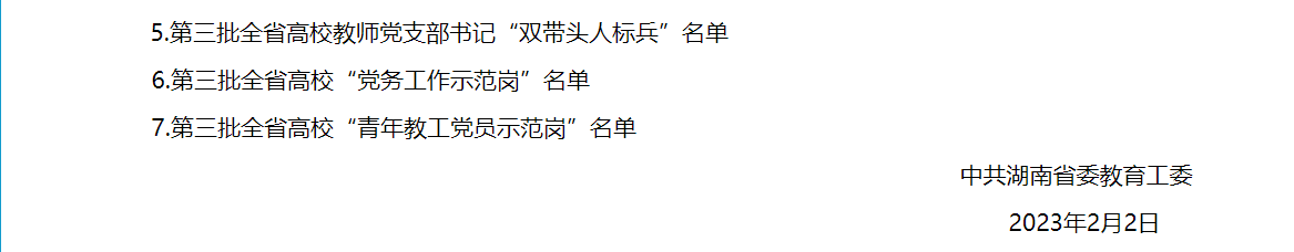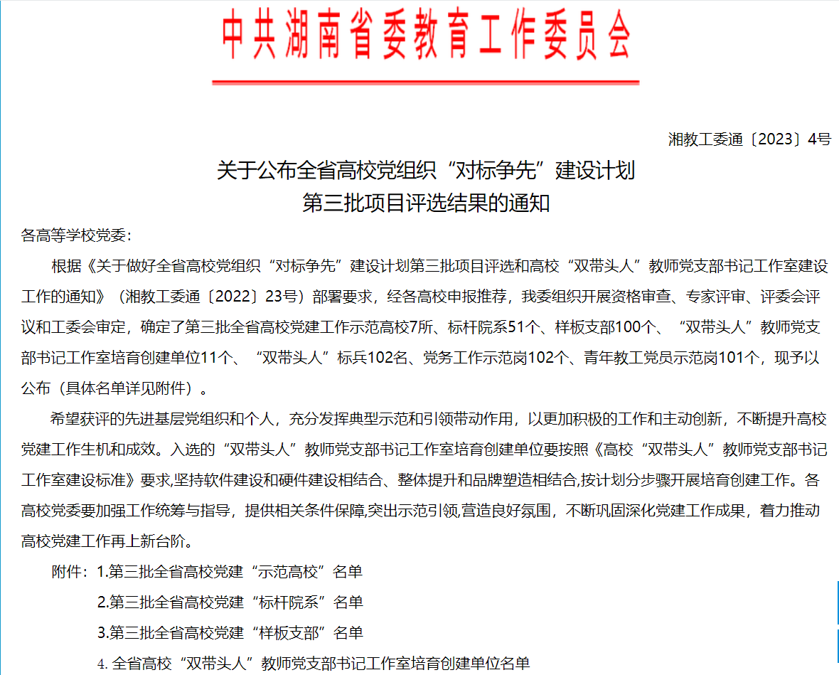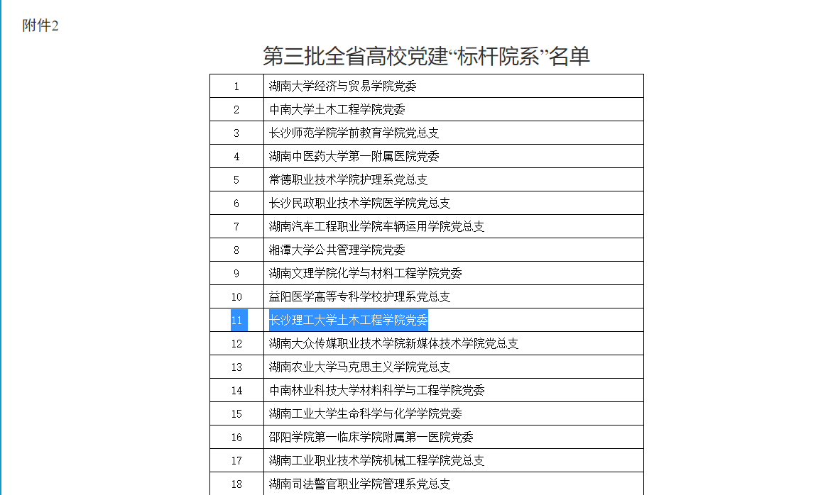 2月6日,中共湖南省委教育工委发布通知公告——《关于公布全省高校党组织“对标争先”建设计划第三批项目评选结果的通知》(湘教工委通〔2023〕4号),长沙理工大学土木工程学院获评第三批全省高校党建“标杆院系”。