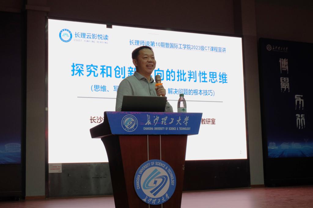 10月31日晚,国际工学院与学校图书馆联合主办的“长理师说第10期暨国际工学院CT课程宣讲活动”在云塘校区学活报告厅隆重举行。本次活动由校图书馆馆长杜荣华担任主讲,国际工学院党委副书记兼副院长乔法光主持,校图书馆批判性思维与创新教育教研室全体教师、国际工学院师生代表约300余人参与。
