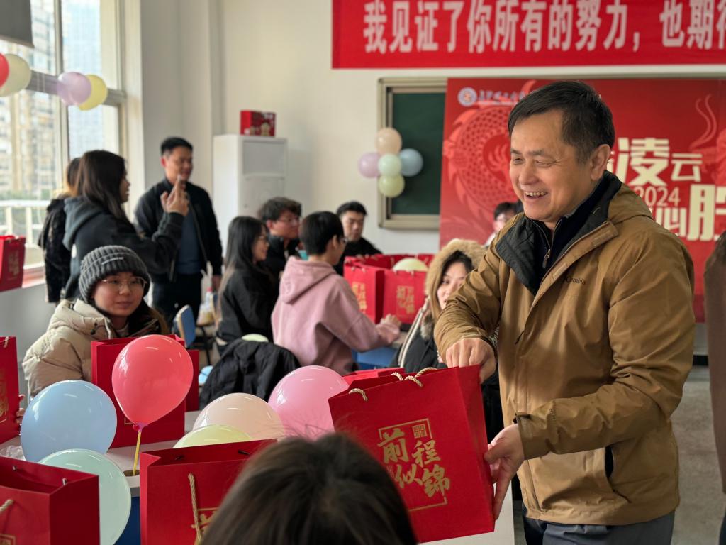 活动当天,考研自习室成为了爱的汇聚地。“考研之路不易,能坚持到现在的你们都非常了不起!学院是大家最坚强的后盾,希望你们能够保持积极的心态,全力以赴,相信自己,相信未来。无论结果如何,你们都是学院的骄傲!”院党委书记施一满一行带着满载祝福的“前程似锦”礼包,逐一走访考研自习室,将这份特别的礼物亲手送到每位考研学子手中。礼包中有实用的文具套装,象征着“笔笔如意”的金榜题名笔,还有寓意“旺气冲天”的旺仔牛奶,每一份礼物都蕴含着学院对学子们的美好祝愿与深切期待。