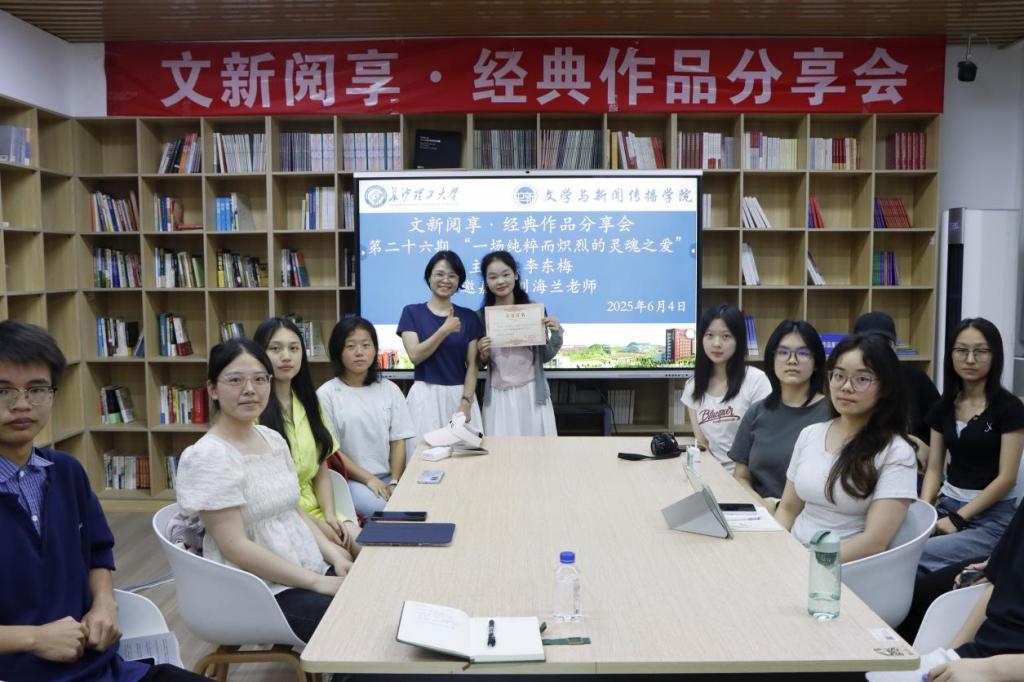 6月4日晚,我院第二十六期“文新阅享.经典作品分享会”在长沙理工大学金盆岭校区九教317师生发展中心举行。主讲人汉语言2404班李东梅以“一场纯粹而炽热的灵魂之爱”为主题,深入探讨夏洛蒂·勃朗特的《简·爱》,中文系教师刘海兰作为特邀嘉宾出席。