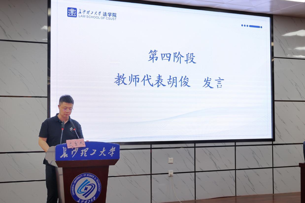 教师代表胡俊充分肯定了同学们四年来的蜕变——从初遇法律的晦涩到能条理解决复杂案例,从朴素正义向往到能用法律平衡事实规则。他还提出三点殷切期望:一要坚守法治信仰,守护规则,在现实落差中捍卫正义;二要永葆学习热忱,适应法典修订与新兴领域挑战,以终身学习做时代前行者;三要常怀悲悯之心,用法律温暖他人,化解矛盾传递温度。