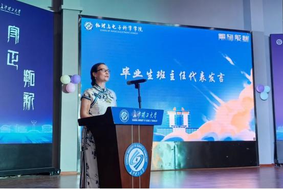 典礼在一段精心制作的大学生涯回顾视频中拉开帷幕。视频里,课堂上激烈的思辨场景、实验室中攻坚克难的专注神情,以及校园活动里洋溢的青春活力,一帧帧画面如电影般闪过,勾起了毕业生们无数美好的回忆。随后,各班班长怀着感恩之心,向班主任与导师代表鞠躬致谢,现场温情涌动。毕业生班主任代表吴丽娟老师深情致辞,她回忆起学生们初入校园时的青涩模样,到在专业实践中逐渐蜕变、独当一面的成长历程,言语间满是欣慰与不舍。吴老师叮嘱学子们,未来无论身处何方,都要“调整心态、终身学习、健康生活”,并暖心承诺“母校永远是你们的港湾”,这番肺腑之言令不少学生红了眼眶。