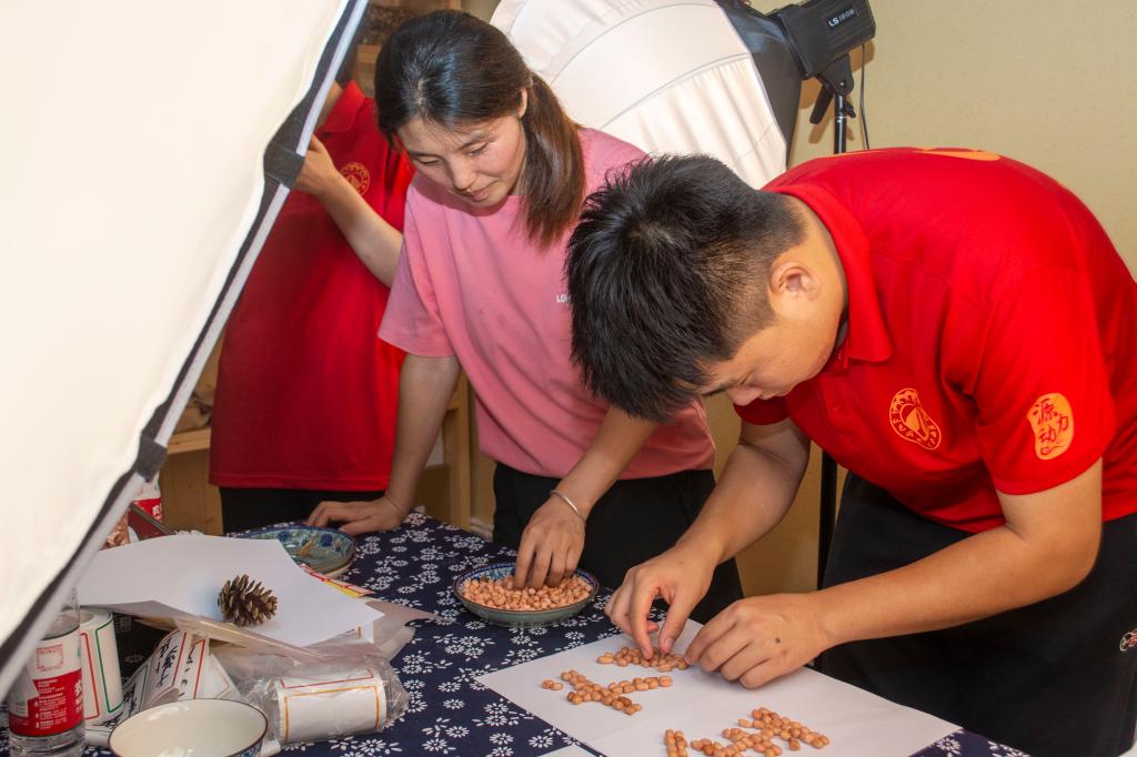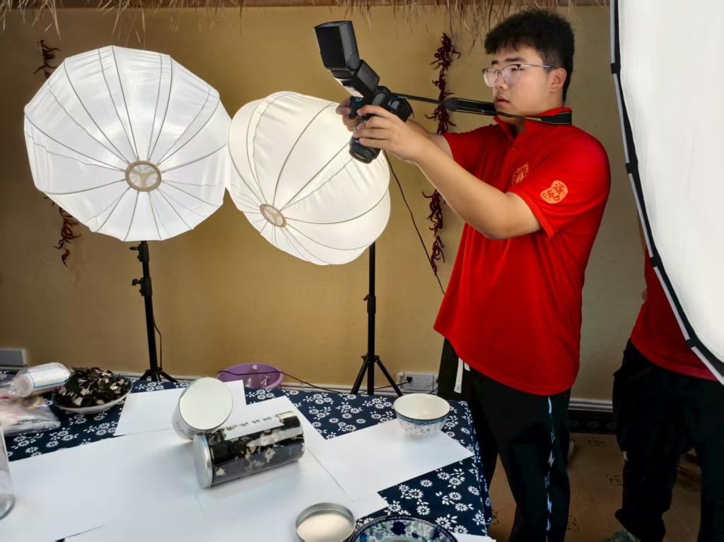 在村支书侯红艳和项目对接负责人吴瑛的介绍下,队员们分头行动,每人负责一种农产品,结合其特点构思拍摄方案并进行拍摄。从盐菜的酸爽质感再到石耳的珍惜特质,从干香菇的菌褶到花生的圆润饱满,队员们用相机、打光灯、乡土道具,将每种农产品的卖点转化为直观的视觉语言。这些饱含巧思的宣传图将成为山货的“名片”,带着蜂蜜的醇厚、石耳的珍稀、腊肉的鲜香、土鸡蛋的均衡营养、萝卜干的咸香走向更广阔的市场。