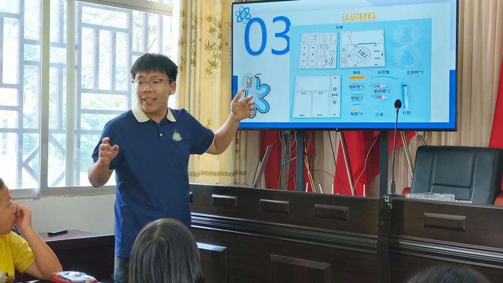 按下手柄,清澈的水流便应声涌出。7月14日,在张家界市桑植县走马坪白族乡走马坪村的村委会里,长沙理工大学物理与电子科学学院“小小科学家”乡村振兴科普教育团队的成员正带领乡村儿童亲手组装和操作手压抽水机。伴随着孩子们兴奋的惊呼声和热烈的掌声,一堂别开生面的乡村科普课堂正在上演,这是该团队暑期“三下乡”活动中一堂扎根乡土的科普实验课现场。