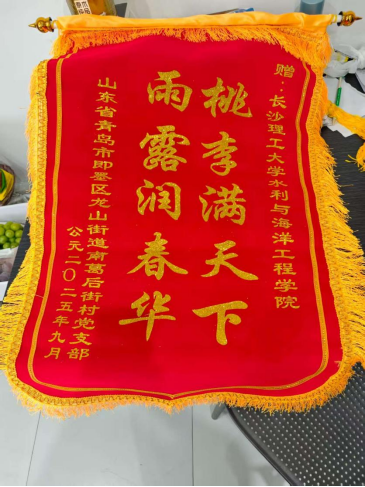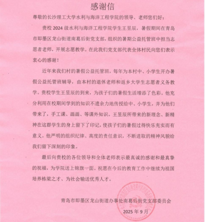 开学伊始,水利学院收到了来自青岛市即墨区龙山街道南葛后街党支部委员会的感谢信与锦旗。信中字字恳切,字里行间满是对长沙理工大学水利与海洋工程学院的感谢和对船海2401班王昱辰的赞誉。这份跨越千里的肯定不仅是对一名学子暑期公益行动的高度认可,更映照出长理学子敢于担当、服务社会的青春底色。