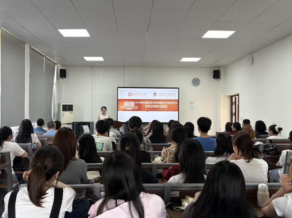 9月16日下午,长沙理工大学中国语言文学与国际中文教育专业2025级硕士研究生导师见面与双选会在金盆岭校区九教417成功举行,文学与新闻传播学院中国语言文学与国际中文教育专业全体研究生导师及研究生新生参与了此次会议,文学与新闻传播学院党委委员兼中文系主任黄婧主持此次会议。