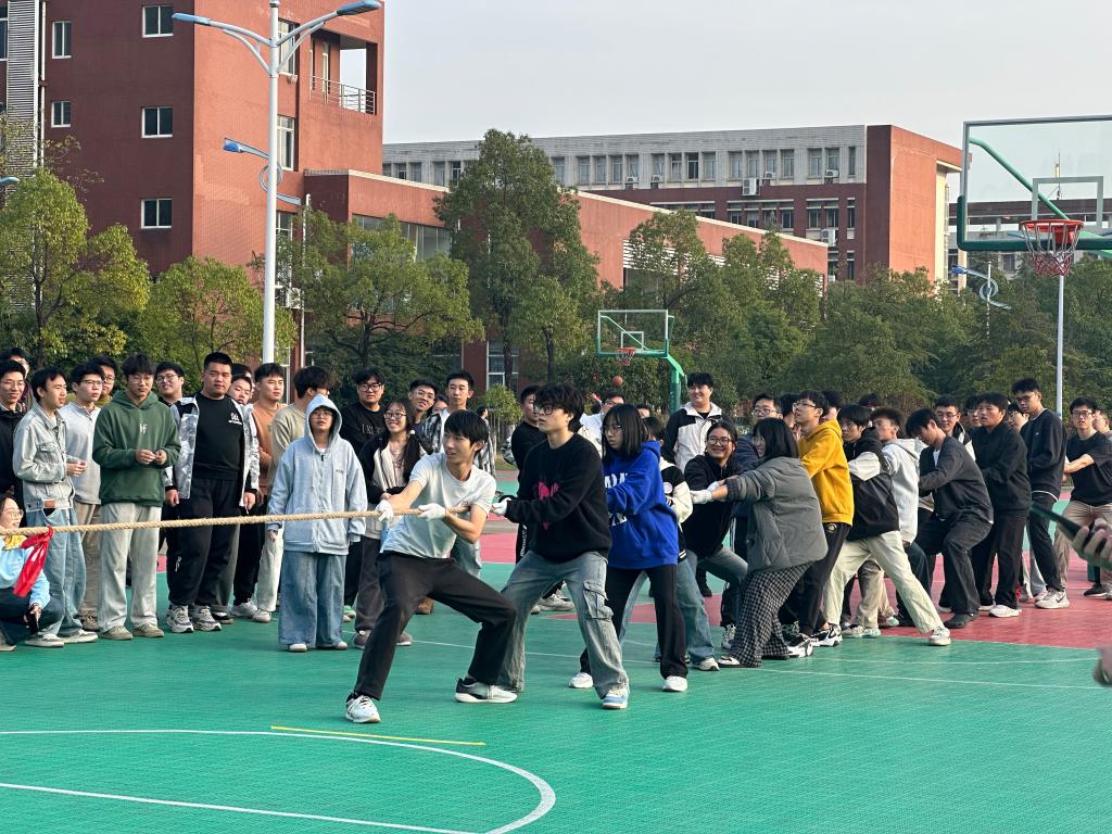 拔河比赛将现场气氛推向高潮。各班队伍精神抖擞、严阵以待。哨声响起,队员们紧握麻绳、全力后倾,中间红绳左右摇摆,牵动人心。场边加油声震耳欲聋,每场较量都是意志与力量的碰撞。年级辅导员和班主任们也深受感染,纷纷呐喊加油,与同学们共享比赛激情。