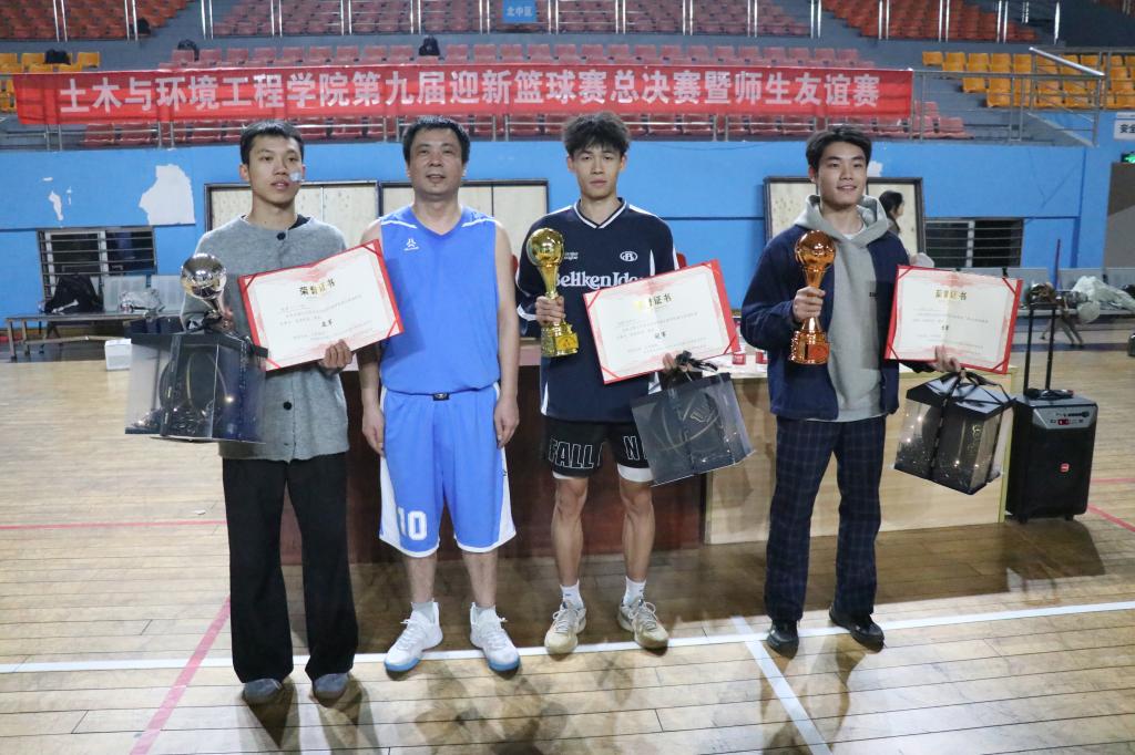 随后师生友谊赛正式开始。师生以篮球为媒介,双方友好交流互动,拉近彼此距离,赛场氛围轻松融洽。比赛结束后,球员与参赛老师握手致谢,土木与环境工程学院老师为本次迎新篮球赛获奖队伍颁奖。