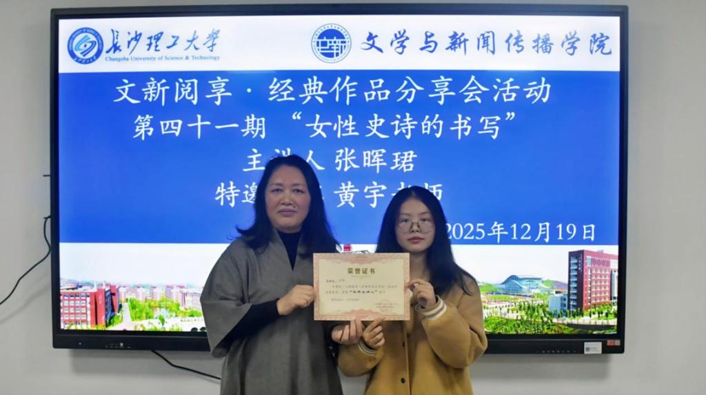 12月19日晚,文新学院第四十一期“文新阅享·经典作品分享会”于金盆岭校区九教223室团体成长辅导室顺利举办。本期活动由汉语言2304班张晖珺同学主讲,以“女性史诗的书写”为主题,深入解读了埃莱娜·费兰特的《那不勒斯四部曲》。中文系黄宇老师作为特邀嘉宾参与本次活动。