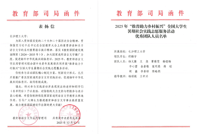 近日,教育部语言文字应用管理司与共青团中央青年发展部联合评选的2025年“推普助力乡村振兴”全国大学生暑期社会实践志愿服务活动优秀团队评选结果公布,由土木与环境工程学院2024级本科生邱鹏宇领队,杨琪毅和王中兴老师指导的“墨韵知行”团队从全国8013支团队中脱颖而出,入选重点团队并获“优秀团队”称号,教育部语言文字应用管理司与共青团中央青年发展部联合发来表扬信。