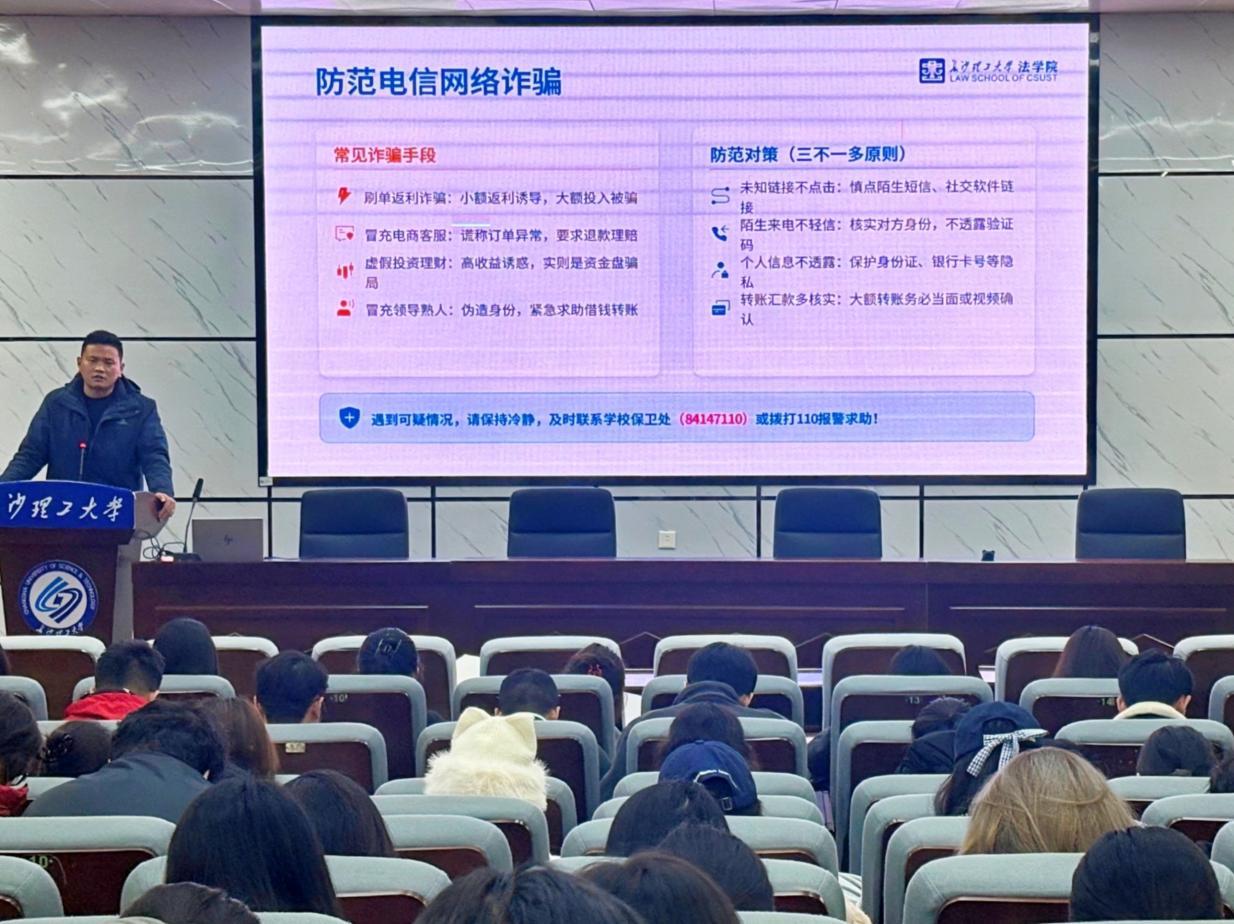 会上,兰贵辉围绕安全教育、规范制度、学业职业规划、宿舍建设等四个方面展开讲解。在安全教育环节,他结合近期案例提醒学生注意出行安全和宿舍防盗,针对电诈高发态势,警示同学们做到“不相信、不转账、不点击链接”,同时提醒大家法学专业学生未来一年学业压力大,要注意心理健康问题,学会自我调剂和主动求助。在规范管理方面,兰贵辉根据学校相关管理规定和要求,重点强调了走读、周末离校、节假日登记、日常请销假等手续办理流程及要求,要求班委、党员强化责任意识,全体同学遵守相关纪律要求。