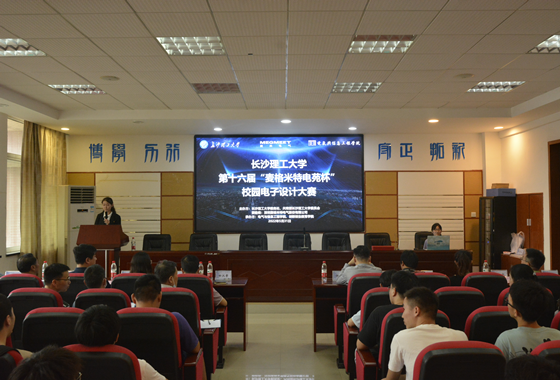5月31日下午,长沙理工大学第十六届“麦格米特电苑杯”校园电子设计大赛决赛在云塘校区工科一号楼B503顺利开幕,项目作品展示在工科一号楼东门前坪举行。深圳麦格米特电气股份有限公司总经理兼工会主席谢志伟、研发总监田汉章、研发经理朱伟贵、人事主管郑茂娟、软件高级工程师王霖众,长沙理工大学教务处副处长李平、电气学院党委书记符慧林、党委副书记陈仁凯、党委副书记兼副院长任艮丰、副院长王文出席,电气学院老师张一斌、贾智伟、贺科学、范必双、文卉、马钧等担任本次大赛评委。大赛共有来自各学院共68个项目组参赛,140余名同学到场参赛。