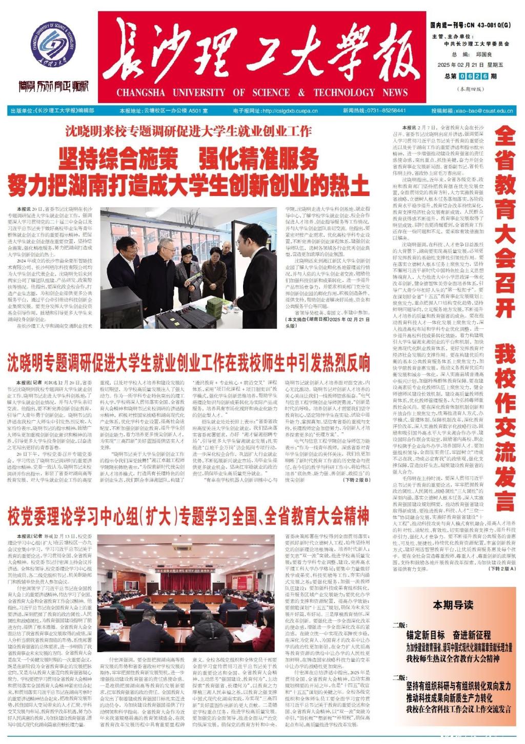2月20日,省委书记沈晓明在长沙专题调研促进大学生就业创业工作,强调要深入学习贯彻党的二十届三中全会以及习近平总书记关于做好高校毕业生等青年群体就业创业工作的重要指