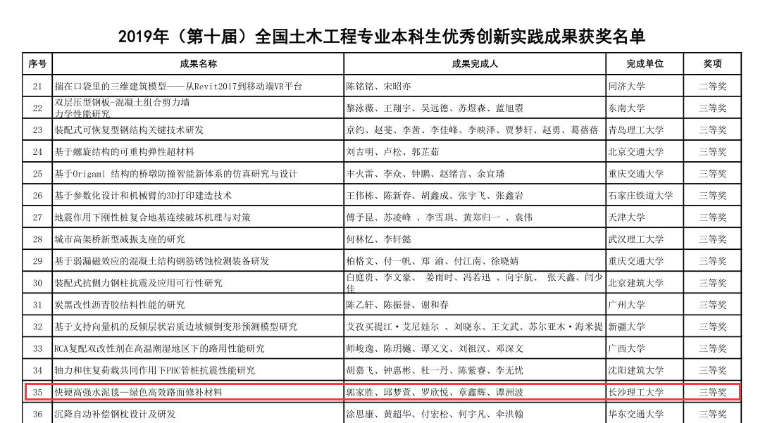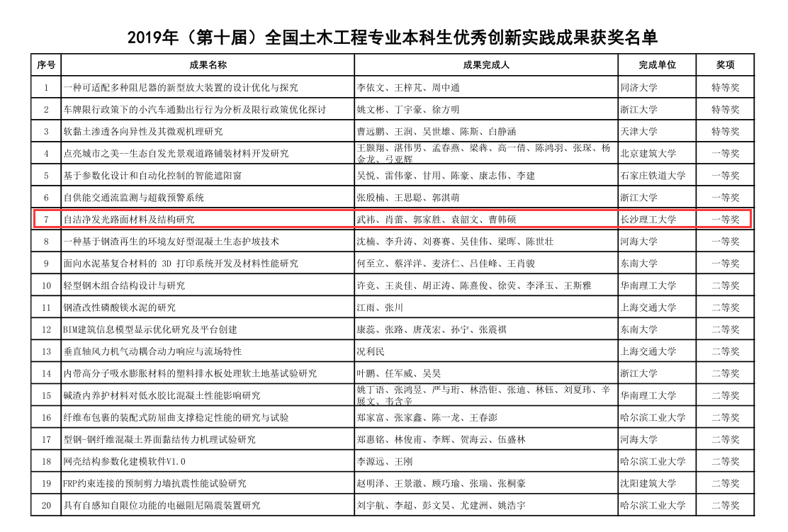 获奖项目为由交通学院土木工程(道路工程)专业武祎、肖蕾、郭家胜、袁韶文、曹韩硕同学完成的“自洁净发光路面材料及结构研究 ”项目(指导教师:交通学院高英力教授);交通学院土木工程(道路工程)专业郭家胜、邱梦萱、罗欣悦、章鑫辉、谭洲波同学完成的“快硬高强水泥毯——绿色高效路面修补材料”项目(指导教师:交通学院李九苏教授)。 2项成果依托“国家级大学生创新创业训练计划项目”,“校级大学生创新创业训练计划项目”,也是目前雷竞技官网在此项国家级赛事中取得的最好成绩。