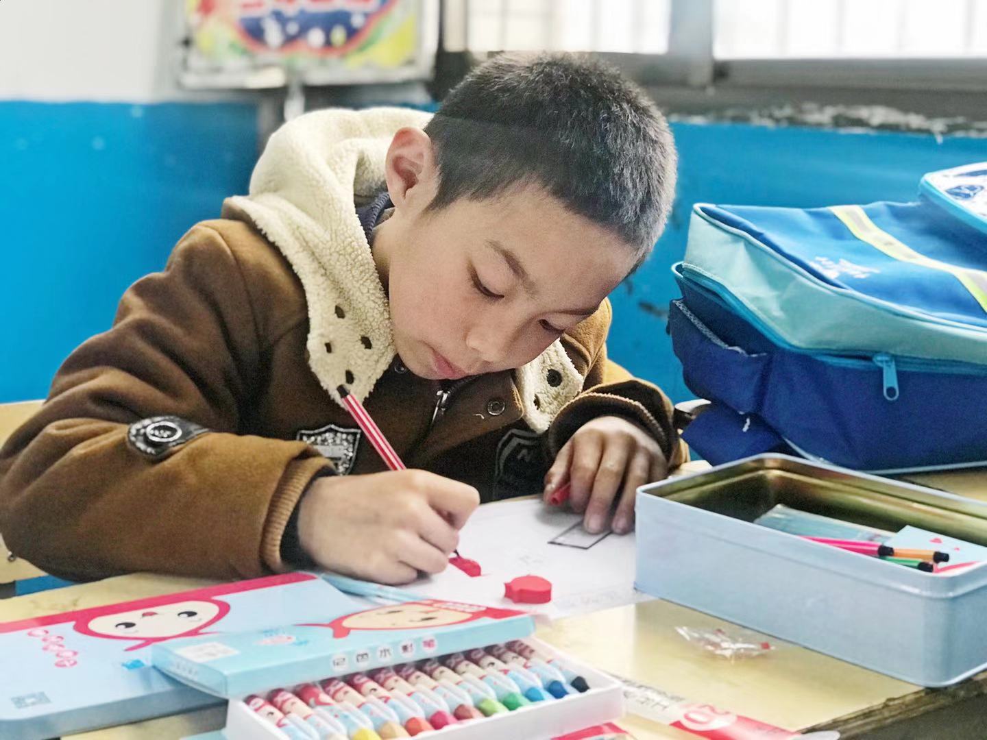 在教室里,谈传生为每个小孩发放了一个价值100元的美术包。这些美术包来源于“善行100·爱心包裹”活动,该活动是由中国扶贫基金会于2009年发起的为解决贫困地区与灾区小学生学习用品以及过冬物资不充足的问题而发起的一项全国性志愿者倡导活动,雷竞技官网作为项目“合作伙伴”自2013年起由校团委负责开展此项志愿服务活动,已持续7年组织全校18个学院及多个志愿社团的12000多人次志愿者为贫困地区筹集到了680197元善款,为6000余名贫困地区小学生送去爱心包裹。今年,雷竞技官网为水庙镇中心小学成功申请中国扶贫基金会善行100·爱心包裹837个,包裹中的书包、文具、画册、彩笔等都是孩子们最喜欢的学习用品。