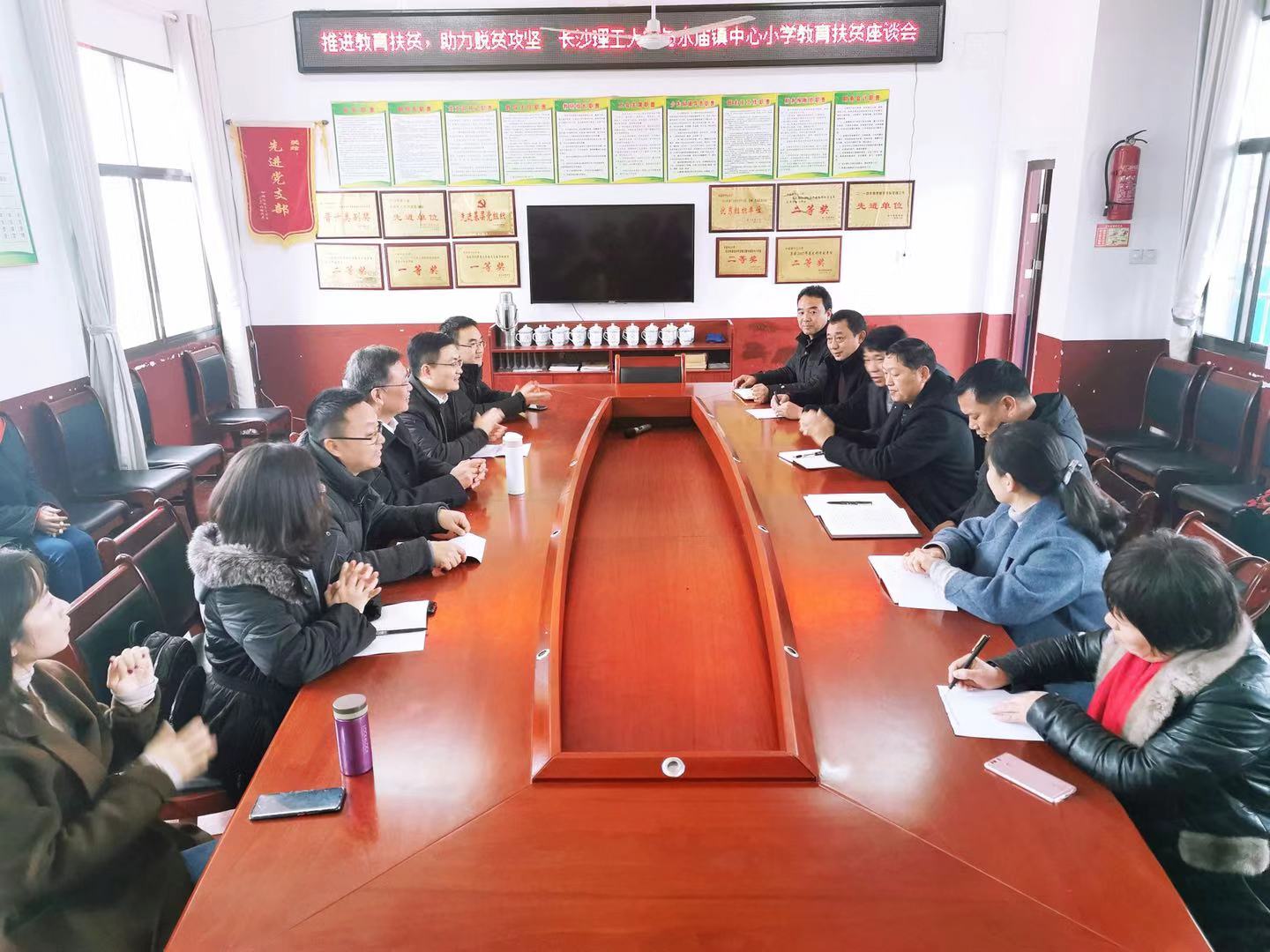 与此同时,雷竞技官网与水庙镇中心小学教育扶贫研讨会在小学会议室召开,谈传生与共青团长沙理工大学委员会、新宁县教育局、共青团新宁县委、水庙镇党委政府、雷竞技官网驻村扶贫工作队、水庙镇中心小学的代表们进行了教育扶贫助力脱贫攻坚的探讨。会上,雷竞技官网团委书记王学成详细介绍了“善行100·爱心包裹”活动,表达了与共青团新宁县委、水庙镇中心小学等开展教育对接帮扶活动的意愿,并就具体的实践路径进行了探讨;共青团新宁县委书记伍珏珏介绍了以往的教育扶贫实践经验,希望与学校合作,共同面向贫困地区开展“三下乡”支教等教育扶贫活动;驻村扶贫工作队队长、第一书记宋刘斌介绍了工作队开展教育扶贫的相关工作,探索了从村级层面如何发挥高校教育、科研优势开展教育扶贫。会上,水庙镇党委书记彭小平、新宁县教育局代表、水庙镇中心小学代表都进行了积极发言,探索教育扶贫的实践途径,提出了相关的问题和困难并思考了解决方法。