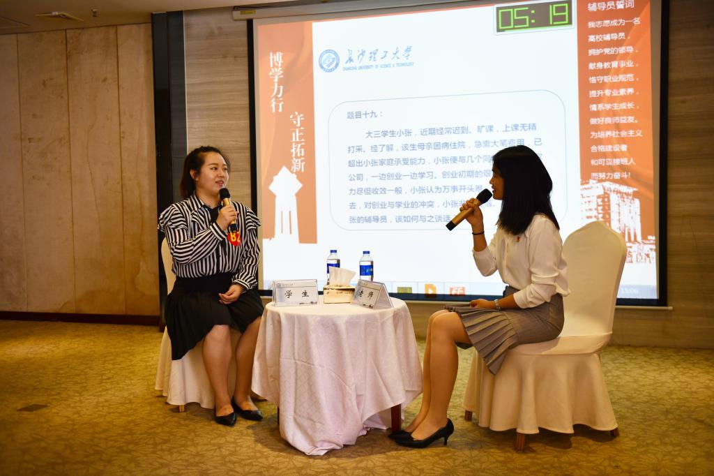 决赛分为笔试、案例分析、理论宣讲和谈心谈话四个环节。6月11日举行了决赛笔试,主要考察了选手对相关知识和基本理论的掌握情况;6月12日举行决赛案例分析、理论宣讲和谈心谈话的现场比赛。在案例分析环节,选手们围绕案例体现的问题本质、解决路径、实施方法及相关启示进行了细致的阐述。在理论宣讲环节,选手们以扎实的理论基础、饱满的精神状态和富有感染力的语言表达充分阐发了观点。在谈心谈话环节,试题都以情景再现的形式出现,选手们分别进行了教师和学生角色扮演,展现出了对学生性格特征、成长成才规律的准确把握和对学生问题的解决与教育引导能力。