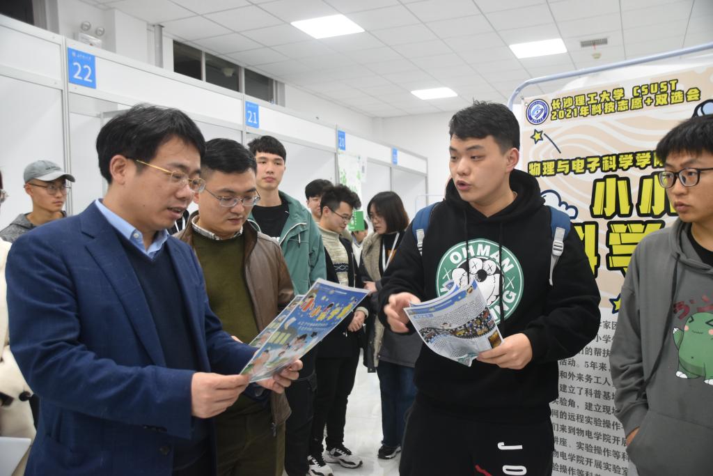 活动以科技实践团队和在校学生为主体,通过现场交流等方式进行双向选择。双选会上,45支科技创新团队借助视频、实物、海报等,从研究方向、科研进展、指导规划等方面介绍团队情况及招聘需求。学生们踊跃自荐,并就志愿服务意向、科创规划等问题与团队负责人深入交流。不少学生在双选会现场“配对”成功,加入了自己感兴趣的团队。
