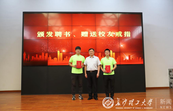 谈传生为2021届校友会会长、秘书长颁发聘书。洪源渤和校友会秘书长、教育基金会秘书长张美红为2021届校友会理事成员颁发了聘书、校友戒及长理文创纪念品。