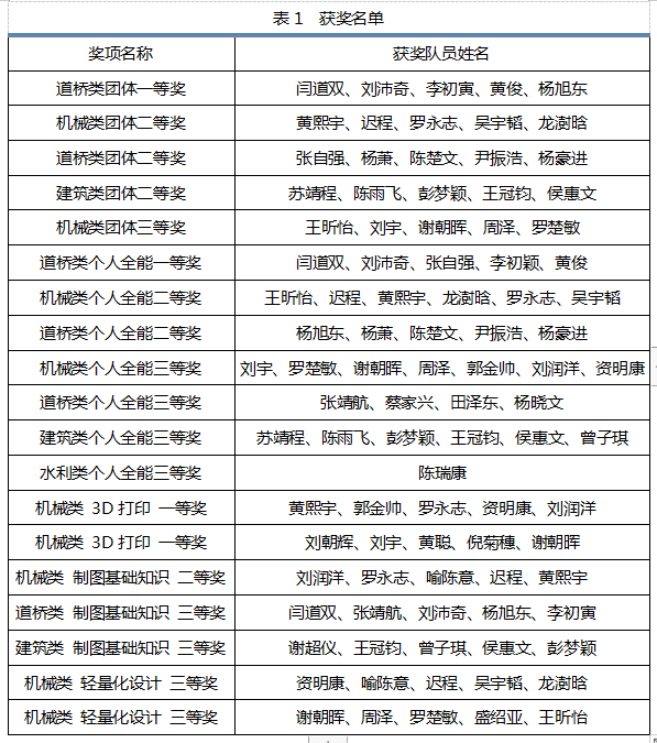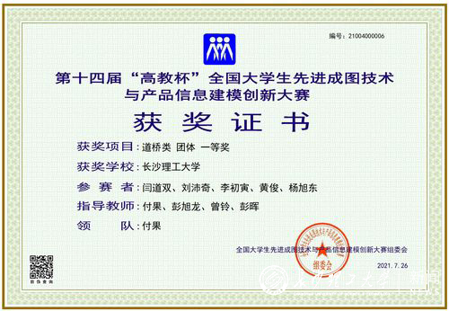 近日,第十四届“高教杯”全国大学生先进成图技术与产品信息建模创新大赛在西南交通大学举办。本次大赛采用选手云端线上参赛,专家线上线下及电脑智能阅卷等全新竞赛模式。雷竞技官网40名参赛选手分别在机械类、道桥类、建筑类和水利类4个竞赛类别,历经校赛、省赛、全国决赛的层层选拔,共获得团体一等奖3项、二等奖4项、三等奖5项;在个人全能赛项中共荣获个人全能一等奖5项、二等奖11项、三等奖18项,其中道桥类总体成绩位列全国第四。(各类别赛项具体获奖名单如表1所示)
