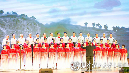 演出结束时,全场离退休老同志起立激动地挥舞手中的小红旗齐声高唱《没有共产党就没有新中国》,歌声在校园中久久回荡。