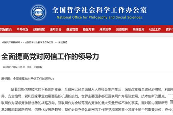 此前,全国哲学社会科学规划办公室门户网站“学坛新论”栏目曾于2018年12月24全文转载推介了张明海教授的决策参考性文章《全面提高党对网信工作的领导力》(原文载《光明日报》,2018年12月24日),得到了学术界和中央网信办的高度关注。