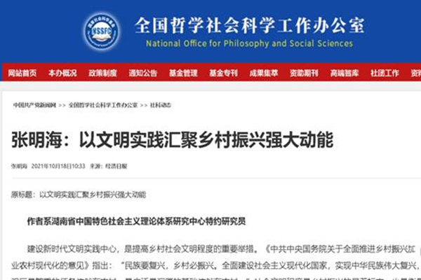 近日,全国哲学社会科学规划办公室门户网站“社科动态”栏目全文转载推介雷竞技官网马克思主义学院张明海教授的研究成果《以文明实践汇聚乡村振兴强大动能》。该成果2021年10月18日发表于《经济日报》,系张明海教授主持的国家社科基金重大招标项目“深化拓展新时代文明实践中心建设方法与路径研究”的阶段性成果。