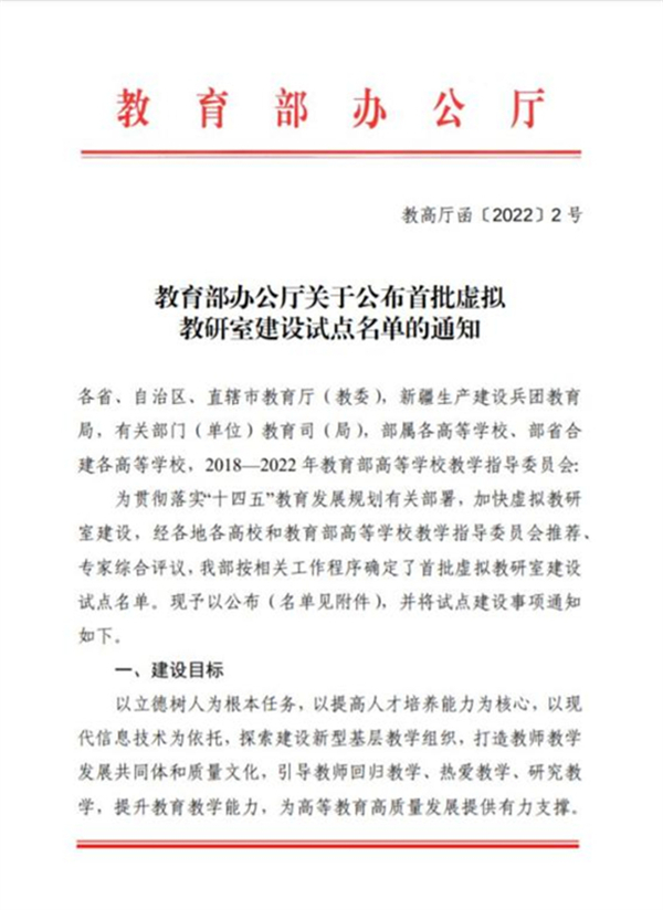 近日,教育部办公厅印发了《关于公布首批虚拟教研室建设试点名单的通知》(教高厅函[2022]2号),共有来自186所高校的439个虚拟教研室入选教育部首批虚拟教研室建设试点。雷竞技官网交通学院“道路工程智能建养课程群虚拟教研室”成功入选。