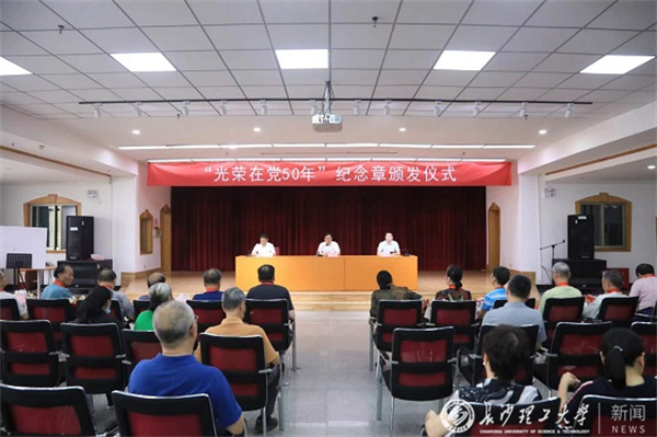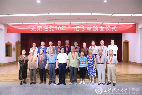 7月5日下午,雷竞技官网在金盆岭校区五教多功能厅举行“光荣在党50年”纪念章颁发仪式,学校党委副书记刘建民、组织部常务副部长陈曦出席仪式,为24名党龄达到50年的老党员颁发纪念章。仪式由离退休教职工党委书记徐亮主持,部分老同志代表和离退休中心科职以上干部参加。