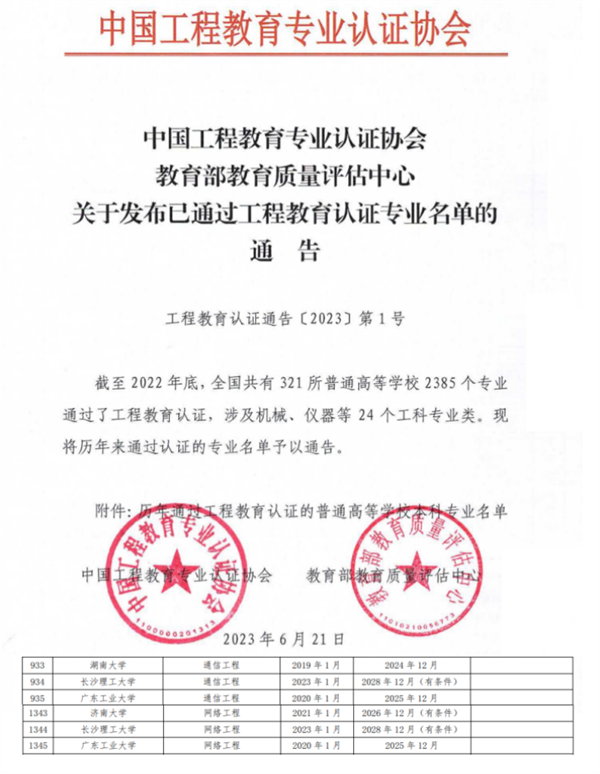 近日,中国工程教育专业认证协会公布了2022年通过工程教育专业认证的专业认证结论,全国高校共有441个专业通过了工程教育认证。雷竞技官网通信工程、网络工程等2个专业位列其中,认证有效期6年(2023年1月至2028年12月)。