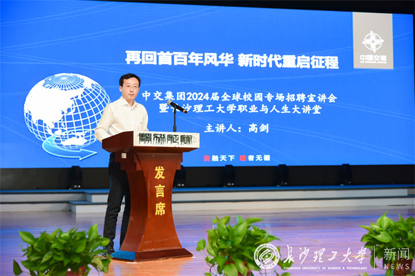 中交路建党委常委总会计师唐世连向长理学子发出诚挚邀请,欢迎广大毕业生加入中交集团。中交集团人力资源部(党委组织部)副总经理(副部长)高剑以《再回首百年风华 新时代重启征程》为题作招聘宣讲暨长沙理工大学职业人生大讲堂授课,从“重任在肩”“时代呼唤”“青春之歌”三个主题谈论中交集团的辉煌成就、中交百年奋斗史以及中交的央企担当。他诚邀长理学子与中交同行,为共同建设具有全球竞争力的“科技型、管理型、质量型”世界一流企业贡献青春力量。