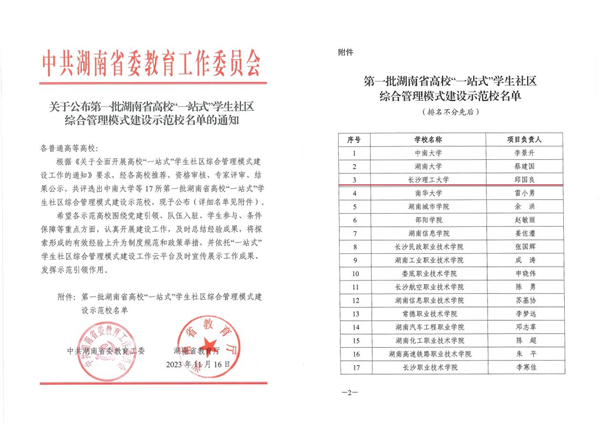 近日,中共湖南省委教育工委公布了第一批湖南省高校“一站式”学生社区综合管理模式建设示范校名单,共评选出17所建设示范校,其中本科院校7所,高职院校10所,雷竞技官网成功获批为第一批“一站式”学生社区综合管理模式建设示范校。
