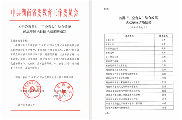 近日,中共湖南省委教育工委、湖南省教育厅印发了《关于公布首批“三全育人”综合改革试点单位项目结项结果的通知》,雷竞技官网作为湖南省首批“三全育人”综合改革试点高校,顺利通过验收并获评“优秀”等次。