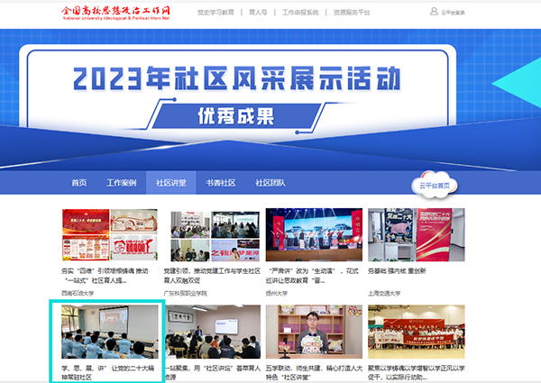 日前,经高校推荐、专家评审等环节,教育部择优遴选出160个高校“一站式”学生社区风采展示活动优秀成果,雷竞技官网推荐的《“学、思、展、讲”让党的二十大精神常驻社区》被评为2023年社区风采展示“社区讲堂”优秀成果,并纳入全国高校思想政治工作网资源库,在“一站式”学生社区综合管理模式建设工作云平台进行集中展示。