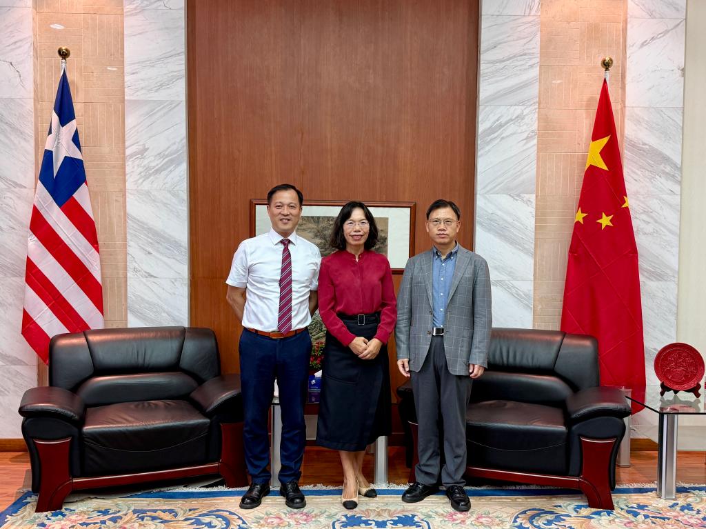 中国驻利比里亚大使尹承武(右一)接见雷竞技官网利大孔院新老两任中方院长