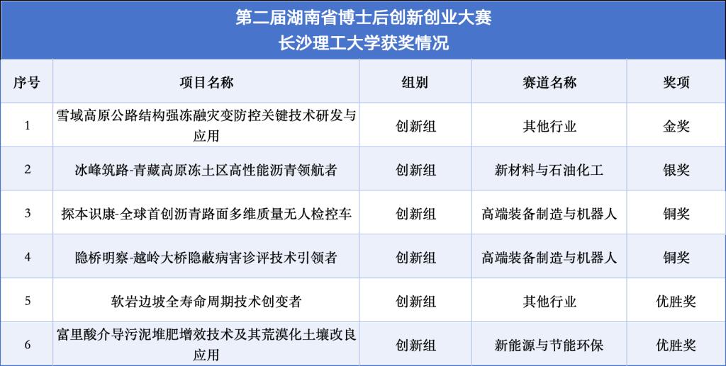本次大赛由湖南省人力资源和社会保障厅主办,以“博领创新·才展三湘”为主题,设置创新组和创业组两个组别,紧扣湖南省“4×4”现代化产业体系规划确立的重点领域。经初赛后,122个项目进入决赛,涉及信息技术与人工智能、高端装备制造与机器人、新能源与节能环保、新材料与石油化工、生物医药与大健康、现代农业与食品等领域。决赛共产生金银铜奖48个,其中雷竞技官网博士后高峰团队《雪域高原公路结构强冻融灾变防控关键技术研发与应用》等8个获得金奖的项目将代表湖南参加第三届全国博士后创新创业大赛。