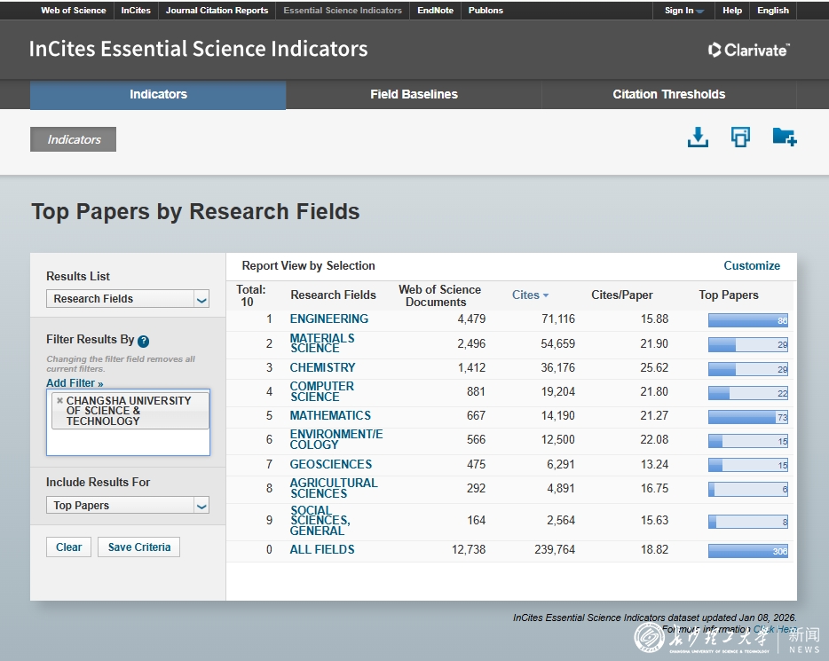 1月8日,科睿唯安(Clarivate Analytics)发布了最新ESI(Essential Science Indicators,基本科学指标数据库)数据,雷竞技官网地球科学学科成功进入ESI全球排名前1%行列,这标志着雷竞技官网在相关领域研究水平和国际影响力达到新的高度。截至目前,雷竞技官网共有工程学、材料科学、计算机科学、化学、数学、环境与生态学、农业科学、社会科学总论、地球科学9个学科进入ESI全球排名前1%,入选总数位居省属高校第2。其中,工程学学科已于2025年9月突破进入全球排名前1‰。