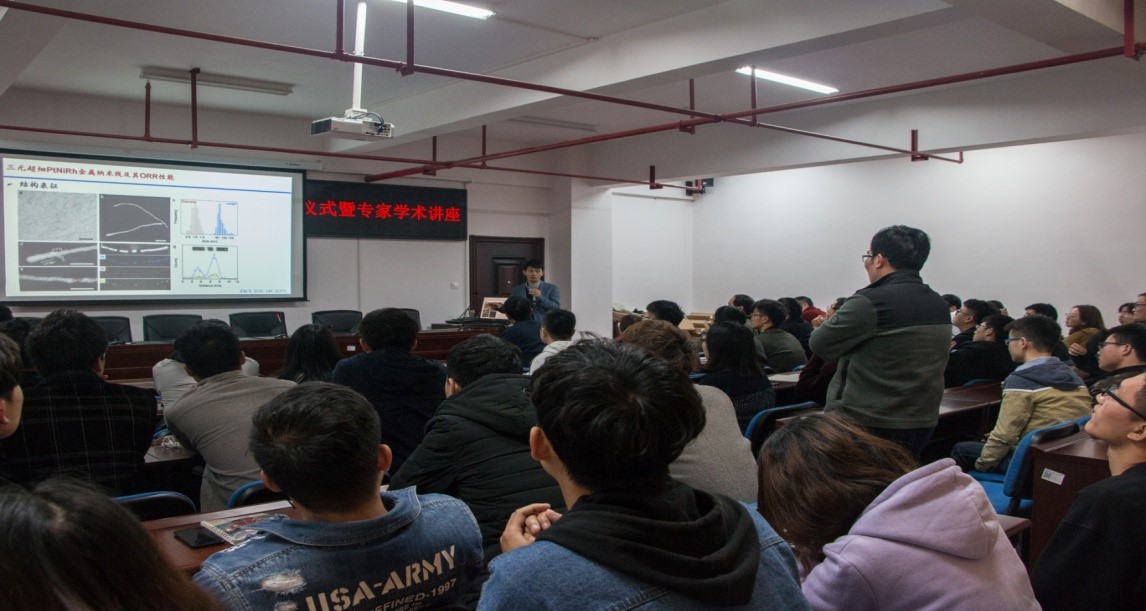 讲座前,范金成教授介绍了黄宏文教授的学术背景。黄宏文教授作了“原子层面精准构筑高效能源转换金属电催化剂”的专题学术报告。他介绍了工业化以来,人类社会依托化石能源虽然取得了飞跃的发展,但是化石能源的过度使用造成了能源短缺、气候变暖、环境污染等诸多问题。发展新型、高效、绿色的能源转为解决上述问题提供了可行的方案,其中,研制高效的电催化剂是推动这些能源技术规模化应用的关键。在原子层面对催化剂的表面微结构进行精准调控是发展高效电催化剂的重要思路,也是目前的科学难题。他介绍了自己在电催化剂精准调控方面的研究工作。