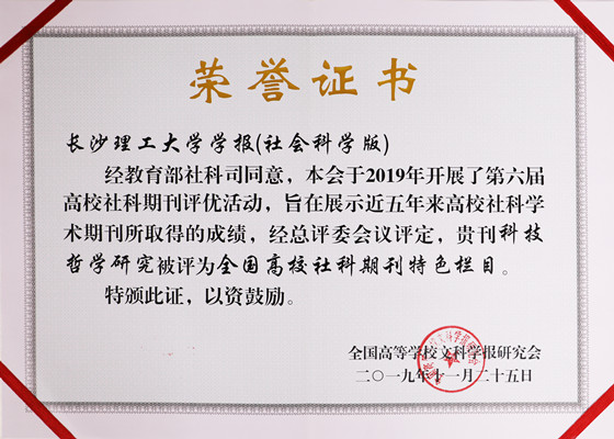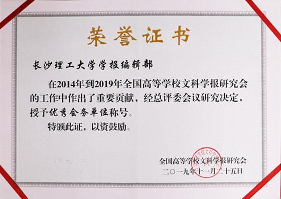 11月25-28日,“双一流”建设背景下高校学术期刊的责任与使命学术研讨会暨全国高校文科学报研究会第八届理事会第五次会议在广东召开,会议公布了第六届全国高校社科学术期刊评优结果,《长沙理工大学学报(社会科学版)》在本次评优活动中获“全国高校社科优秀期刊”称号,“科技哲学研究”被评为“全国高校社科期刊特色栏目”,学报编辑部被授予“优秀会务单位”荣誉。