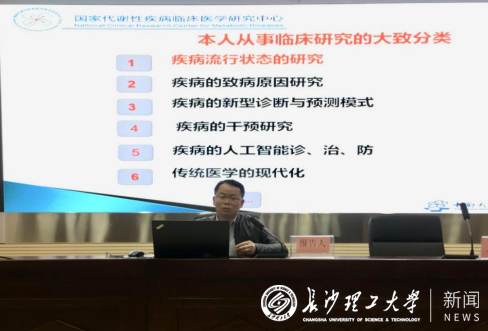 讲座中,周后德从疾病流行状态的研究,疾病的致病原因研究,疾病的新型诊断与预测模式,疾病的干预研究,疾病的人工智能诊、治、防及传统医学的现代化等方面介绍了其从事临床研究的大致分类。并通过阐述一系列统计学模型、统计学研究方法在临床医学中的广泛运用(如logistic回归模型、分位数回归模型、Wilcoxon秩和检验、Fisher精确检验等),论述了数学、统计学在临床医学研究中的重要地位,表示临研处处皆数学,临床医学(疾病预测、诊断指标确定、遗传统计、干预后效果比较)处处需要建立数学模型,表达了与长沙理工大学数学与统计学院合作的期待。