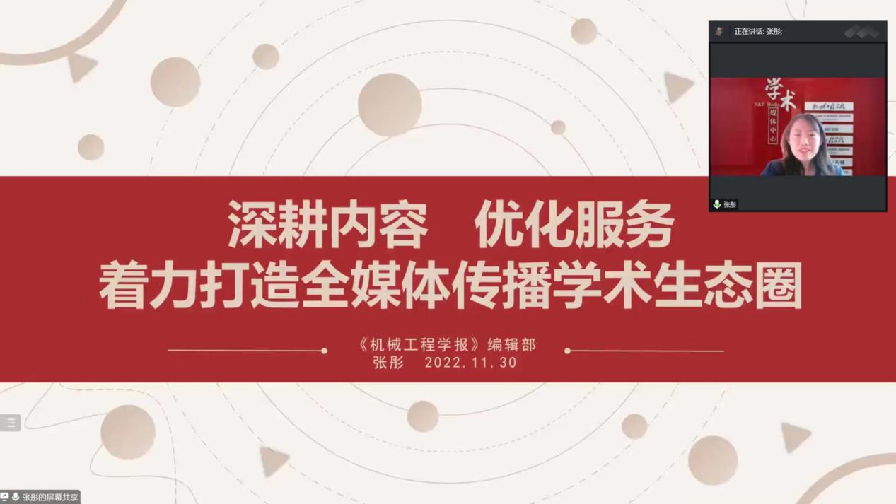 《机械工程学报》编辑部主任张彤以《深耕内容、优化服务,着力打造全媒体传播学术生态圈》为题作了报告,从期刊简介方面详介绍了学术媒体期刊群主要有《机械工程学报》编辑部、《AMF》编辑部、《电气工程学报》编辑部、《中国表面工程学报》编辑部。通过近几年的专题出版,她表示,在专题出版过程中应保持严谨、严肃、求真的态度。她引入期刊论文的传播与服务过程介绍了目前全媒体传播完成了“纸媒+数字+活动+服务+传播”的融合发展的新业态。